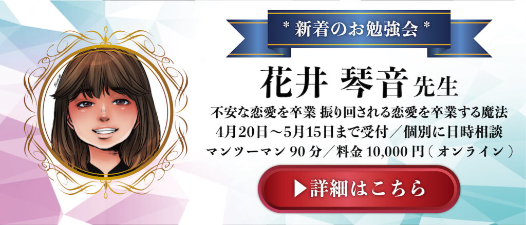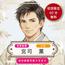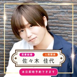 ![]() 宮司薫先生 | 2026.4/12 | Tさま | セッションありがとうございました! 初めての男性カウンセラーさんだったので、どんな感じなんだろう?と若干ドキドキしていたんですが(^O^)落ち着いた、穏やかな声だったので安心して話すことが出来ました☆ なかなか1歩が踏み出せず足踏みしてた所にテコ入れするのが恋愛面も動かす鍵になりそうだったので、とにかく、小さくてもいいから1歩を踏み出します! |